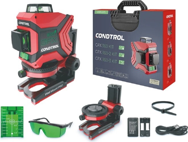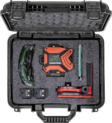 Это профессиональный расширенный комплект, включающий в себя лазерный нивелир GFX 360-3, настенное крепление Wall Mount pro, очки, магнитную мишень, кабельную стяжку, аккумулятор, кабель для зарядки, адаптер для батареек, руководство по эксплуатации и надежный пластиковый кейс. Лазерный уровень-нивелир GFX 360-3 сочетает в себе максимально возможный функционал с последними достижениями в отрасли лазерных инструментов.