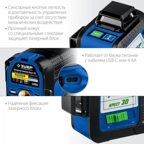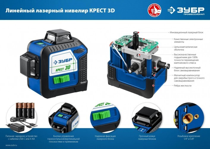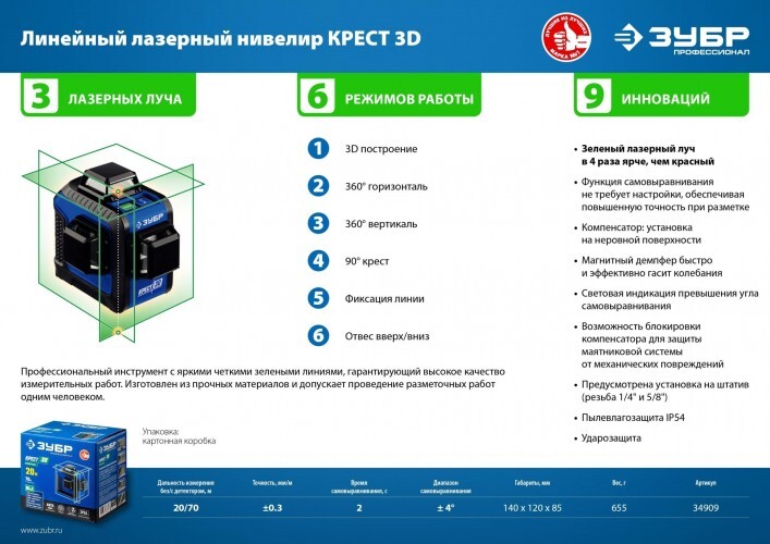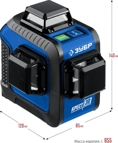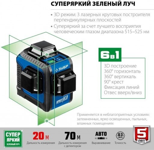 Зеленый нивелир лазерный ЗУБР КРЕСТ 3D 34909, предназначен для генерирования горизонтальной, вертикальной и перпендикулярных линий при проведении разметочных работ. Используется для высококачественного выполнения разметочных работ даже в неблагоприятных условиях: ярко освещенных, затемненных, пыльных, влажных помещениях – благодаря лучшему восприятию человеческим глазом длины волны диапазона 515–525 нм (зеленый свет). Функция самовыравнивания устраняет необходимость настройки, гарантирует максимальную точность при разметке. 3 режима проецирования линий: горизонтальная и две вертикальные линии с развёрткой 360°, благодаря чему луч будет виден в любой точке. Возможность поочерёдного отключения лазерных лучей позволяет оставлять только необходимую для работы световую схему.