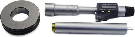 Нутромер микрометрический 3-точечный электронный - прецизионный прибор для определения внутренних линейных размеров деталей и их поверхностей: пазов, отверстий, уступов и т.д. Конструктивно микрометрический нутромер напоминает микрометр, и состоит из микрометрического винта с надежно закрепленным барабаном и стебля с измерительным наконечником. Показания снимают методом отсчета делений по измерительной шкале и сложения с длинами стебля и концевых мер.