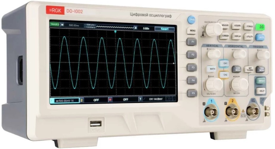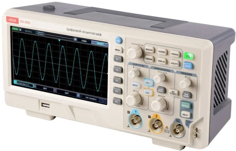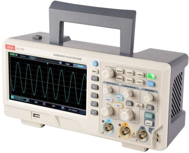 Цифровой осциллограф RGK DO-1002 – компактный двухканальный прибор в настольном исполнении, который отличается от базовой модели серии DO увеличенной в два раза полосой пропускания. Устройство оборудовано 7-дюймовым цветным дисплеем разрешением 800 x 480 и 8-битным АЦП. Наличие USB-интерфейса, обеспечивающего возможность прямого подключения к ПК, расширяет возможности, позволяя реализовать функции дистанционного управления.