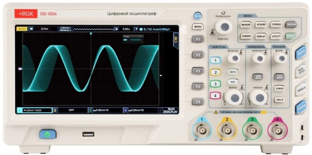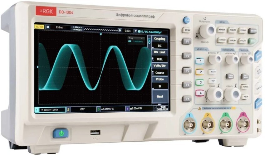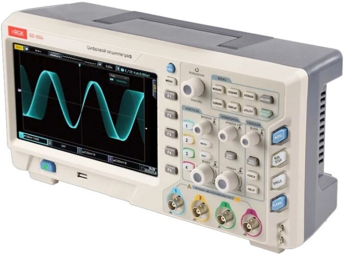 Цифровой осциллограф RGK DO-1004, полоса пропускания которого составляет 100 Мб при максимальной частоте выборки 1 Гвыб/с, построен на основе 8-битного АЦП. Он отличается от других моделей серии DO наличием четырех аналоговых каналов, большей глубиной памяти и расширенной функциональностью, благодаря чему подходит для диагностики и настройки сложных электронных и цифровых устройств. Наличие функции авто-настройки сокращает время подготовки прибора к измерениям, упрощая процесс выполнения работ.